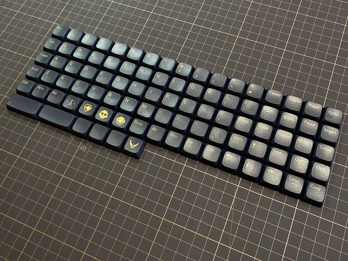 XDAプロファイル、PBT素材で昇華印刷の印字付きのキーキャップセットです。墨色に近いブラックで、オレンジの控えめなフォントで印字がされています。印字はしっかりしています。キー数は少なめですが、Ortholinearや30キーから50キーの1Uを多用する自作キーボードに使いやすい印字キーがあり、便利なセットです。
